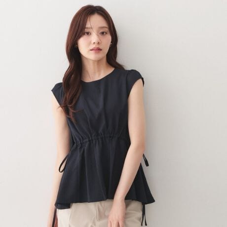 凹凸感のあるシボ素材が印象的なサイドリボンペプラムブラウス