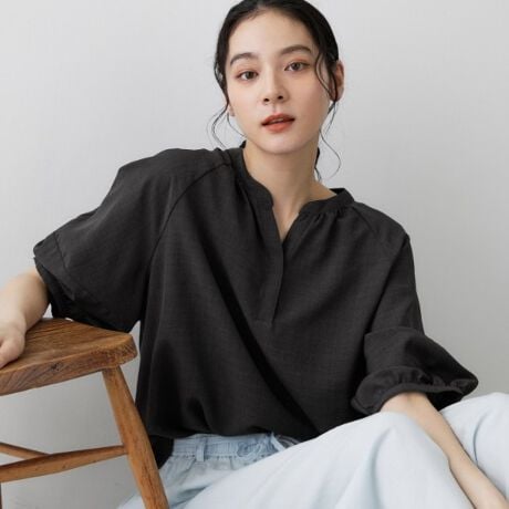 首元をすっきり見せるスキッパーデザインのブラウス。