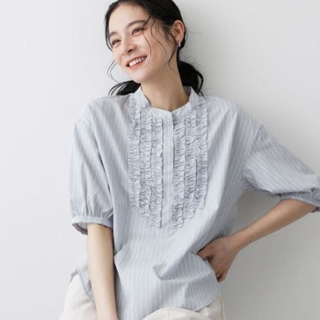 フロントの立体的なフリルデザインが華やかな印象のブラウス。