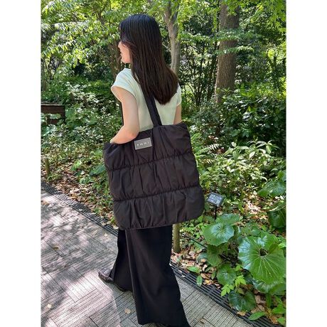 中綿の入った膨らみのあるトートバッグ。本体のキルティングの箇所にギャザーを入れボリュームのあるデザインに。