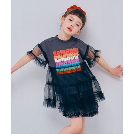 カラフルなプリントとティアードチュールがかわいいTシャツ。