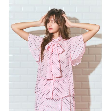 ほどよい肉感ときれいなドレープ感のあるレーヨン素材のグランドに、ハート柄にも見えるドット柄を織り込んだカットジャガード地のブラウス。