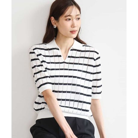 適度なハリとドライなタッチで清涼感のあるニット素材。ストライプ上にアイレットを開け、さらにぼーだー配色を組み合わせた印象的な編地です。