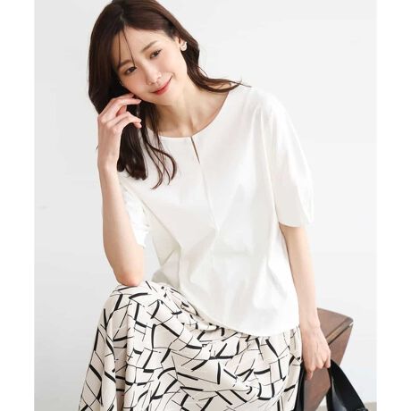 着心地の良いカットソー素材ですが、きれい見えする素材はブラウス感覚で、お仕事などのオンシーンにもおすすめです。身頃はゆったりとしていますが裾は広がらないシルエットなので、カジュアルすぎずラクに着こなせます。