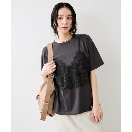 まるでレースキャミソールを重ね着しているかのようにだまし絵風にプリントしたTシャツ。