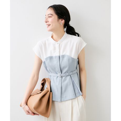 スキッパースタンドカラーシャツとビスチェがドッキングされた一枚で様になるブラウスです。