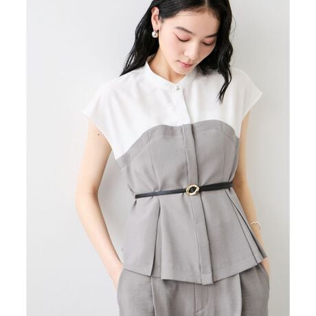 スキッパースタンドカラーシャツとビスチェがドッキングされた一枚で様になるブラウスです。