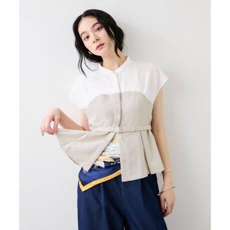 スキッパースタンドカラーシャツとビスチェがドッキングされた一枚で様になるブラウスです。