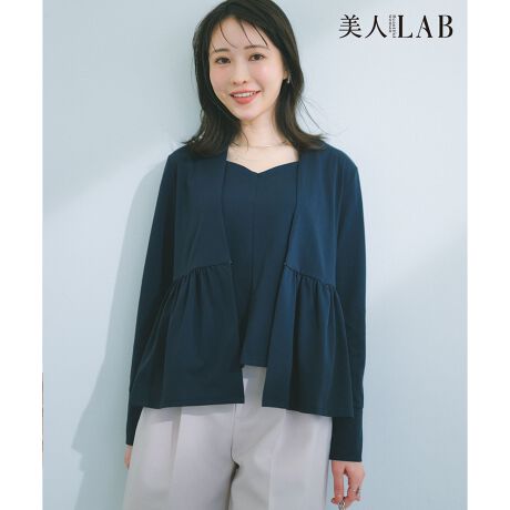 ■デザイン・羽織るだけで上品なニュアンスをプラスしてくれるカーディガンと、1枚でも着映えするカットソーのアンサンブル。・カーディガンは、身体のラインを拾わないペプラムシルエット。・おしりにかかる丈感と切り替えデザインで身頃にゆとりを持たせながら、すっきりとしたVネックラインや袖を太くしすぎないようにすることで、全体のバランスをコンパクトに見せてくれます。・袖口にさりげなく配したパール釦がチャームポイント。・インナーのプルオーバーカットソーは、鎖骨が美しく見える上品なハートネックラインがポイント。・肩口をさりげなくカバーするフレンチスリーブで、程よいフィット&フレアをきかせたペプラムシルエット。・前後差をきかせた着丈や袖デザインで立体的にみせるパターンワークにより、フィットし過ぎず美シルエットになるようこだわりました。・セットでの組み合わせはもちろん、それぞれ単品でも着回しやすく、きれいめお仕事スタイルにもカジュアルスタイルにも相性よくお使いいただけるデザインです。