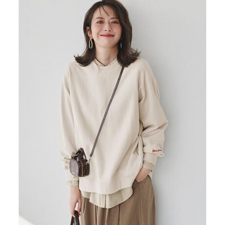 毎年ご好評いただいている、鮮やかなカラーが魅力のスウェットが今シーズンも登場!着丈を少し長めにし、気になるヒップラインを程よくカバー&袖幅をゆったりさせることでレイヤードしやすい仕様にアップデートしました。後ろ裾にはスリットを施しているので、タイトなボトムスからふんわりとしたスカートまで、様々なシルエットのアイテムとバランス良く着こなせるのが魅力です。身頃は生地の縦方向への縮みを抑えるため、地の目を横使いに仕立てていて、丈夫で長く着られるのも嬉しいポイント。さらに、左袖口にはフランス語で「Bonne journee(よい一日を)」というメッセージ刺繍をあしらい、さりげない遊び心をプラスしています。カジュアルながらも上品な印象なので、デニムやチノパンと合わせてデイリーカジュアルに、きれいめパンツやロングスカートと合わせれば、大人のリラックススタイルが完成します。ポケットが付いているのも便利で、お出かけにはもちろん、おうちでのリラックスタイムにもぴったりの一枚です。カラー違いで欲しくなる豊富なカラー展開で、ぶどう色(#080)・マスカット色(#060)・カフェオレ色(#030)、ミルク色(#001)、バナナ色(#040)、ブルーベリー色(#074)、ラベンダー色(#082)、セサミ色(#004)の全8色のライナップです。それぞれ刺繍のカラーも変えていて、ぶどう色(#080)にはボルドー、マスカット色(#060)にはグレー、カフェオレ色(#030)にはミルク、ミルク色(#001)にはレッド、バナナ色(#040)にはライトグレー、ブルーベリー色(#074)にはアイボリー、ラベンダー色(#082)にはスレート、セサミ色(#004)にはサックスの刺繍をあしらい、アクセントにしました。