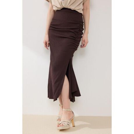 【着る人を選ばない美シルエットのマーメイドスカート】■ポイントギャザーデザインが可愛いマーメイドスカート。カットソー裏地を使用しストレスフリーな着心地もポイントです。■ディテールストレッチ性のある素材を使用し体のラインが綺麗に見えるディテールに拘り、ギャザーから流れる様に裾に繋がるサイドのラッフルとスリットが女性らしいシルエットになっています。■スタイリング簡単にTシャツを合わせたり、ニットトップス、ブラウス合わせがおすすめ◎■生地透け感:なし裏 地:あり伸縮性:あり光沢感:なし厚 さ:薄手[注意事項] ※画像の商品はサンプルです。実際の商品と仕様、加工が若干異なる場合があります。 ※画像の商品は光の照射や角度、お使いのモニター環境により、実物と色味が異なる場合がございます。 ※着用、お取り扱いの際は、アテンションタグをご確認ください。