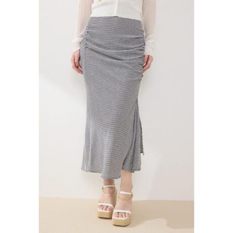 【着る人を選ばない美シルエットのマーメイドスカート】■ポイントギャザーデザインが可愛いマーメイドスカート。カットソー裏地を使用しストレスフリーな着心地もポイントです。■ディテールストレッチ性のある素材を使用し体のラインが綺麗に見えるディテールに拘り、ギャザーから流れる様に裾に繋がるサイドのラッフルとスリットが女性らしいシルエットになっています。■スタイリング簡単にTシャツを合わせたり、ニットトップス、ブラウス合わせがおすすめ◎■生地透け感:なし裏 地:あり伸縮性:あり光沢感:なし厚 さ:薄手[注意事項] ※画像の商品はサンプルです。実際の商品と仕様、加工が若干異なる場合があります。 ※画像の商品は光の照射や角度、お使いのモニター環境により、実物と色味が異なる場合がございます。 ※着用、お取り扱いの際は、アテンションタグをご確認ください。
