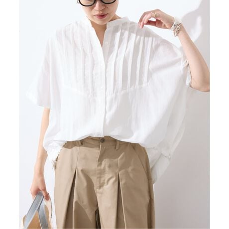 フロントに施したピンタックが上品さを演出するブラウス。