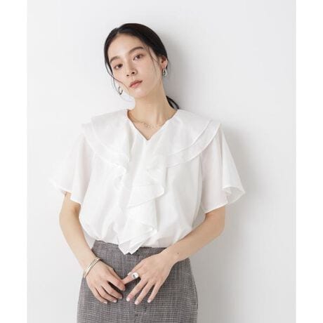 襟元にあしらったラッフルフリルが印象的なVネックブラウス。二重に重ねたフリルがふんわりと立体感を構築し、顔まわりを華やかに惹き立てながら、スタイリングの主役になる一枚です。