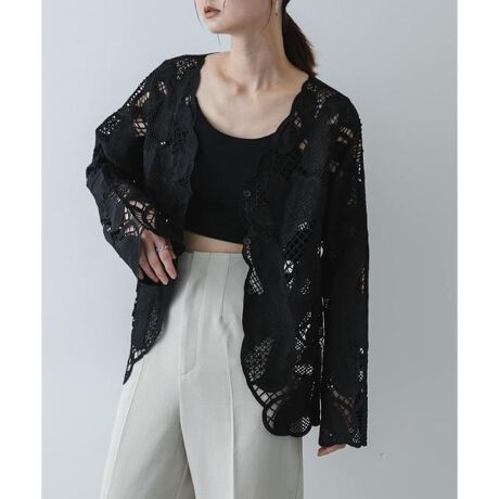 表情豊かなレースが、日常のコーディネートをドラマティックに彩ります。程よい透け感は、キャミソールやTシャツの上にさらりと羽織るだけで、等身大の自分らしい洗練されたスタイルを叶えます。デニムでカジュアルダウンしても、クリーンなスラックスでまとめても美しく決まる一着です。