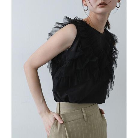 ・上品な光沢感のプレーティング天竺カットソーに、繊細なシアーチュールを贅沢にドッキング。クリアでシンプルな質感の中に、奥行きのある表情をプラス