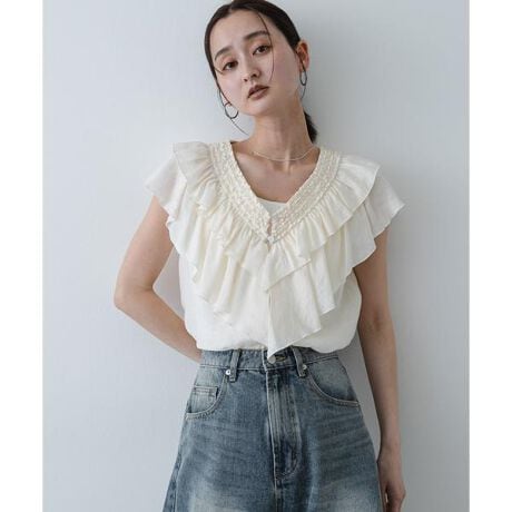 【視線を惹きつける贅沢なフリル。Vネックが導くスッキリとした顔周りと、着映えシルエット】