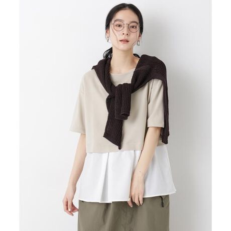 異素材を組み合わせたドッキングデザインが魅力のトップス。上身頃はさらっとしたカットソー素材、裾は軽やかなシャツ地で切り替え、動きのあるシルエット。ヒップにかかる丈感とゆったりシルエットで、体型カバーと快適な着心地を両立した一着です。