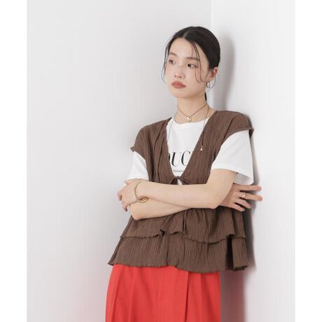 裾に広がるティアードがポイントの楊柳デザインブラウス。清涼感のある楊柳素材とボリュームたっぷりのギャザーとフレンチスリーブがポイント。Tシャツなどと合わせて、ビスチェっぽく着こなすのもおすすめです。