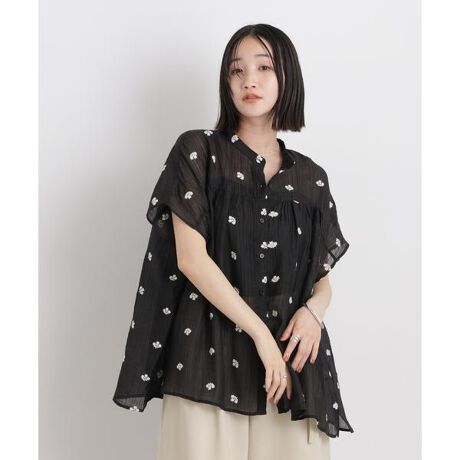 ゆったりとしたシルエットに、小花柄の刺繍が大人可愛く映えるブラウス。軽やかなシアー素材がほどよい抜け感を演出し、着るだけでこなれた印象に。きれいめスカートで上品にまとめたり、ハーフパンツでラフに着崩したり、合わせるアイテム次第で幅広いスタイリングを楽しめる一枚です。