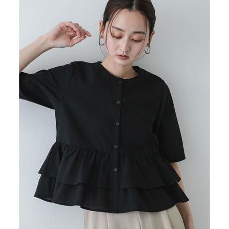 ・首元をスッキリと見せるノーカラーデザイン。フリルの華やかさを引き立てつつ、顔周りは知的に、落ち着いた印象へ