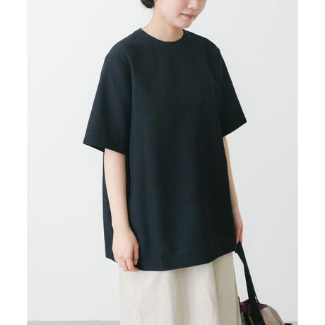 強撚の麻調ポリエステル素材は、さらっとして肌離れが良いので真夏まで活躍します。オーバーサイズのサイズにプルオーバー。前だけインしても着用できコーディネートが組みやすいシンプルデザインになっております。イージーケアのためデイリーに活躍するアイテムです。同素材のボトムとセットアップスタイルもお勧めです。