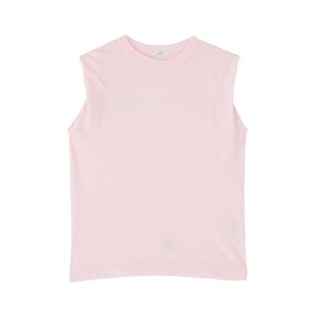 余裕のある身幅と太めのバインダー仕上げのスリーブレスカットソー。折りあげたような袖口のディテールがさりげなく二の腕をカバーします。