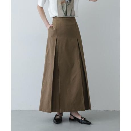 ・フロントに施されたボックスプリーツが、歩くたびにドラマチックな揺れを演出。広がりすぎないセミフレアのラインが、よりスマートに魅せます