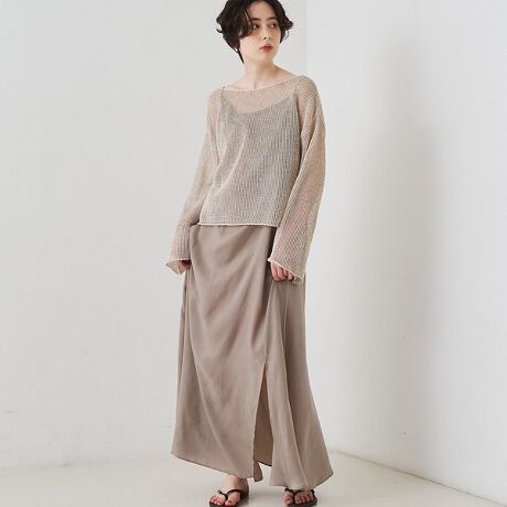 フロントとバックで印象を変えたキャミソールワンピースです。フロントはすっきりとしたタイトなライン、バックは分量感のあるフレアシルエットに仕上げています。バックのみに入れたドロスト紐でシルエット調整ができ、ニュアンスのある着こなしを楽しめます。グレージュとグレーの2色展開です。