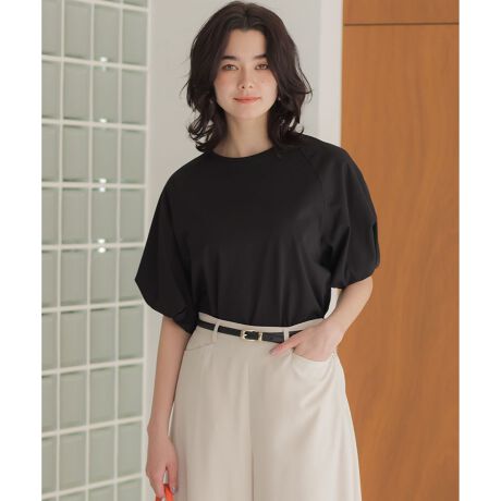 ■デザイン・ふんわりとしたバルーンスリーブがフェミニンな印象のカットソートップス。・ラグランスリーブ仕様で、ほどよくゆとりのあるシルエット。ストレスフリーな着用感です。・裾を前後差のあるラウンドヘムにすることで、ボトムスにインしてもアウトにしてもバランス良く決まります。