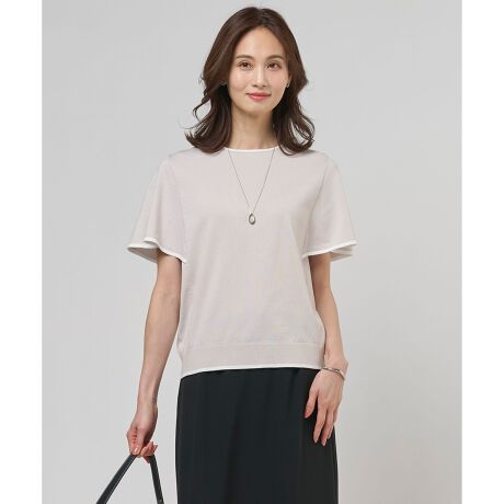 ■デザイン襟と袖口、裾に施した配色ラインがアクセントになった、フレアスリーブのニットプルオーバーです。フレアスリーブの下はスリーブレスの仕様になっており、風が抜けるので、さらっと快適な着心地をキープしてくれます。涼しげなデザインでありながら、脇や二の腕など隠したいところはしっかり隠せるデザインになっています。袖のフレアも分量をおさえているので派手過ぎず、上品に着ていただけます。カラーは、洗練された印象のネイビー(#075)、柔和な雰囲気のグレージュ(#033)、春らしく華やかなサックス(#073)の3色展開です。