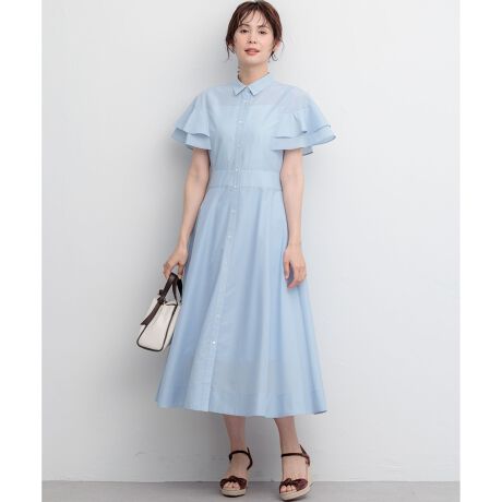■デザイン・透け感のある上品な素材を使用し、女性らしさを引き立てるフィット&フレアのワンピース。軽やかで涼しげな印象を演出します。・身頃からつながる両袖のフリルは、腕の動かしやすさとボリューム感のバランスにこだわり、甘くなりすぎないエレガントな印象に仕上げています。・ウエスト部分は後ろゴム仕様にすることで、締め付け感なく自然にウエストラインを強調。快適な着心地とスタイルアップを両立しました。