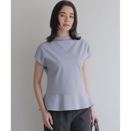 ■デザイン・ほどよいハイネックデザインとペプラム裾が女性らしさを引き立てるカットソートップス。・裾にあしらわれたペプラム切り替えがフェミニンな雰囲気を演出するとともに、ウエストの細見え効果を後押ししてくれます。・袖は少し長めのフレンチスリーブ仕様で、気になる肩回りや二の腕のラインを優しくカバーします。・きれいめな素材感なので、テーパードパンツを合わせたきちんと感のあるオフィススタイルから、デニム合わせの休日カジュアルまで、シーンを問わず幅広く活躍する頼れるアイテムです。