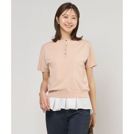 ■デザインアクセサリーのような小粒のメタル釦がポイントのヘンリーネックのニットプルオーバーです。袖は半袖のドルマンスリーブデザインで、涼しげでエレガントな印象に仕上げました。二の腕が隠れる袖丈なので、安心してきていただけます。袖口の部分に施した繊細なラメのラインがアクセントに。アクセサリーいらずで、一枚でスタイリングがサマになるきちんと感のあるニットになっています。カラーは、洗練された印象のネイビー(#075)、ニュアンス感のあるグレージュ(#033)、爽やかなライトミント(#063)、肌なじみの良いサーモン(#012)の4色展開です。