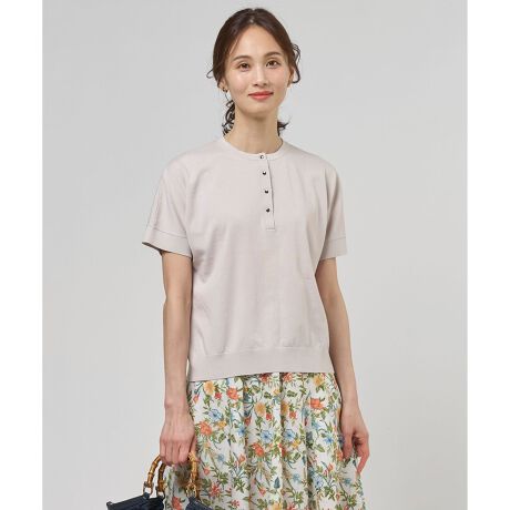 ■デザインアクセサリーのような小粒のメタル釦がポイントのヘンリーネックのニットプルオーバーです。袖は半袖のドルマンスリーブデザインで、涼しげでエレガントな印象に仕上げました。二の腕が隠れる袖丈なので、安心してきていただけます。袖口の部分に施した繊細なラメのラインがアクセントに。アクセサリーいらずで、一枚でスタイリングがサマになるきちんと感のあるニットになっています。カラーは、洗練された印象のネイビー(#075)、ニュアンス感のあるグレージュ(#033)、爽やかなライトミント(#063)、肌なじみの良いサーモン(#012)の4色展開です。