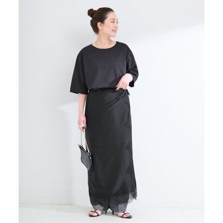 CO/NYのHIGHCOOLという機能糸を編み上げたプレーティング天竺を使用し、夏でも快適に着られる一枚です。 詰まりすぎない衿ぐりと長めの袖丈で大人な印象に。ファッション性のあるシームラインや、細やかなステッチワークにこだわったシンプルなデザインに、トレンドのランジェリー系の繊細なレースを周囲にトリミングした大判スカーフ付きです。 スカーフは、腰に巻いたり肩掛けしたりと、コーディネートにアクセントをプラスしてくれます。