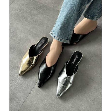 メタリック Vカット フラット ポインテッドトゥ ローヒール ミュール パンプス サンダル