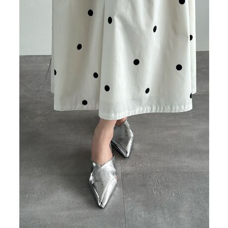 メタリックな素材が上品さとモードさを兼ね備えるミュール。