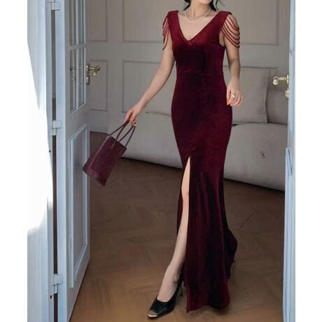 マーメイドシルエットとデコルテを美しく見せるV開きで、女性らしい上品なラインを演出します。