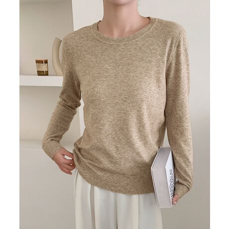 丸首デザインで首元をすっきり見せつつ、上着を羽織ってもかさばりにくい薄手の素材感です。