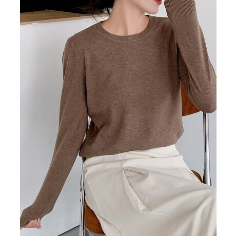丸首デザインで首元をすっきり見せつつ、上着を羽織ってもかさばりにくい薄手の素材感です。