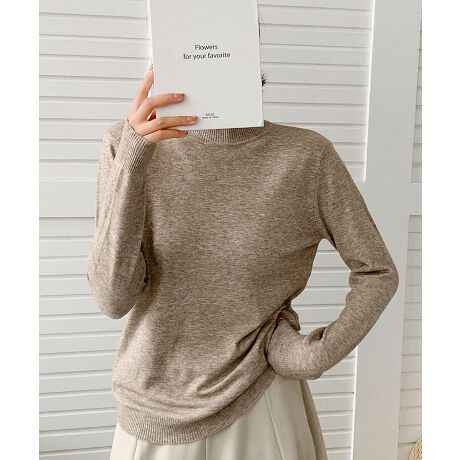 丸首デザインで首元をすっきり見せつつ、上着を羽織ってもかさばりにくい薄手の素材感です。