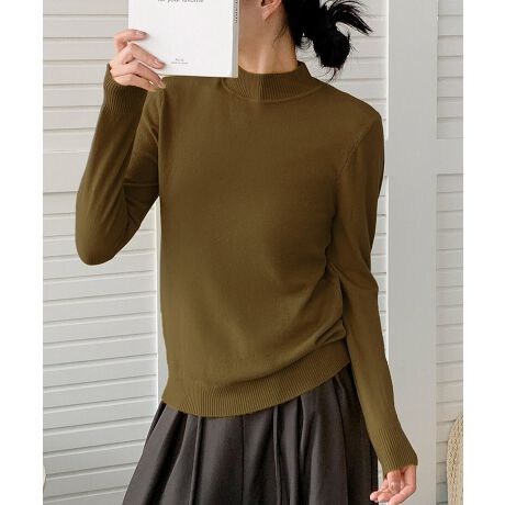 丸首デザインで首元をすっきり見せつつ、上着を羽織ってもかさばりにくい薄手の素材感です。