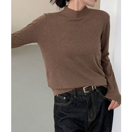 丸首デザインで首元をすっきり見せつつ、上着を羽織ってもかさばりにくい薄手の素材感です。