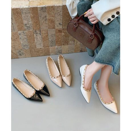 エナメル スタッズ ポインテッドトゥ フラット パンプス 歩きやすい