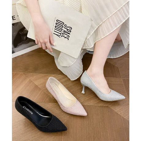 落ち着いた質感の生地を使用したカジュアルシーンからオフィスまでぴったりのパンプス。