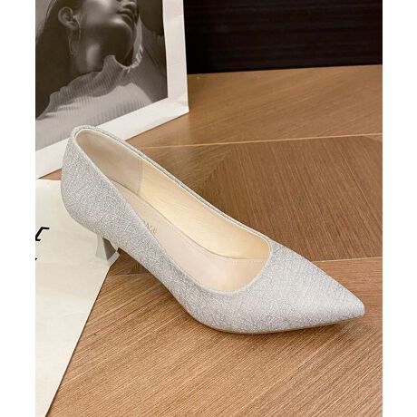 落ち着いた質感の生地を使用したカジュアルシーンからオフィスまでぴったりのパンプス。