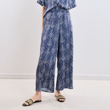 [型番:30-61-09-589]ライン状のタイル柄が印象的なワイドパンツ。ブルーとホワイトの配色で清涼感のあるスタイリングに仕上がります。ゆとりのあるシルエットと軽やかな素材で動きやすく、ウエストはゴム仕様で快適な穿き心地に。シンプルなトップスはもちろん、同柄シャツと合わせた統一感のあるコーディネートにも取り入れやすいデザインです。