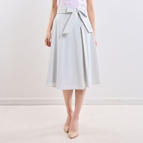 [型番:30-61-08-811]ウエストのリボンがポイントのタックスカート。タックを入れることでほどよく広がるシルエットに仕上げ、動きのあるラインを演出します。リボンは結び方によって印象を変えられ、取り外してシンプルにも着用可能。トップスをインすることでウエストまわりがすっきりと見え、バランスよく着こなせます。きれいめからデイリーまで幅広く取り入れやすいデザインです。