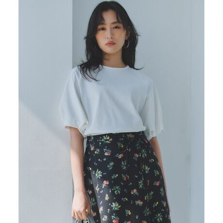■デザイン・ふんわりとしたバルーンスリーブがフェミニンな印象のカットソートップス。・ラグランスリーブ仕様で、ほどよくゆとりのあるシルエット。ストレスフリーな着用感です。・裾を前後差のあるラウンドヘムにすることで、ボトムスにインしてもアウトにしてもバランス良く決まります。